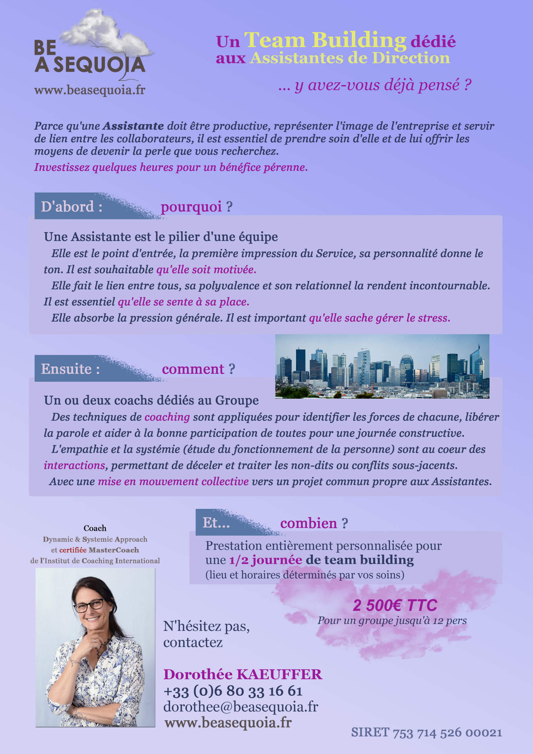 Parce qu’une Assistante doit être productive, représenter l’image de l’entreprise et servir de lien entre les collaborateurs, il est essentiel de prendre soin d’elle et de lui offrir les moyens de devenir la perle que vous recherchez. Investissez quelques heures pour un bénéfice pérenne.